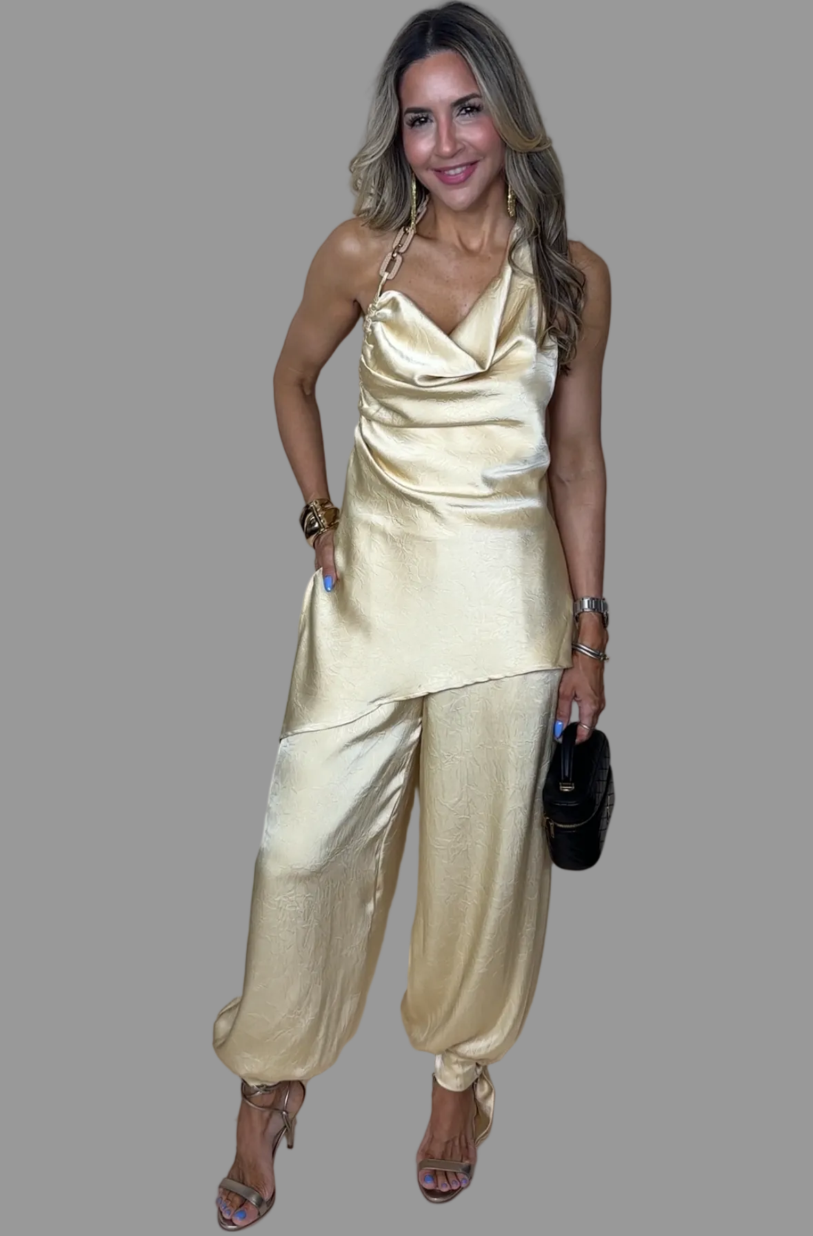 -Top cuello tipo "cowl neck", se amarra en la espalda baja para ajuste, asimétrico en la parte de abajo